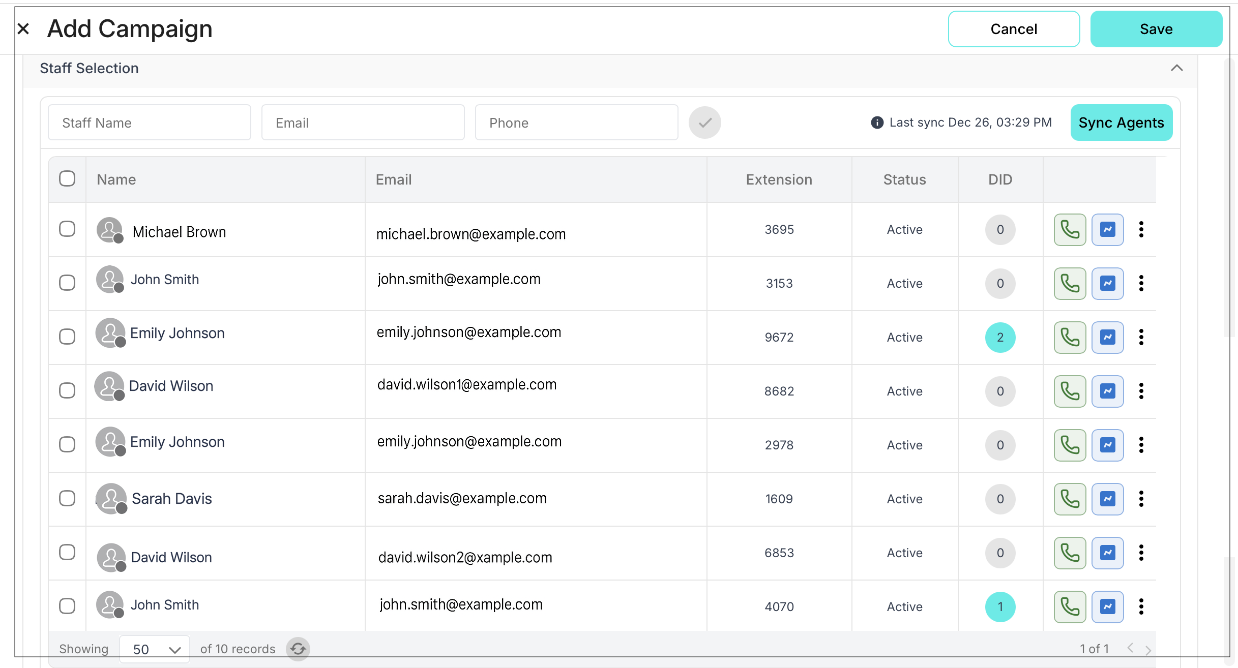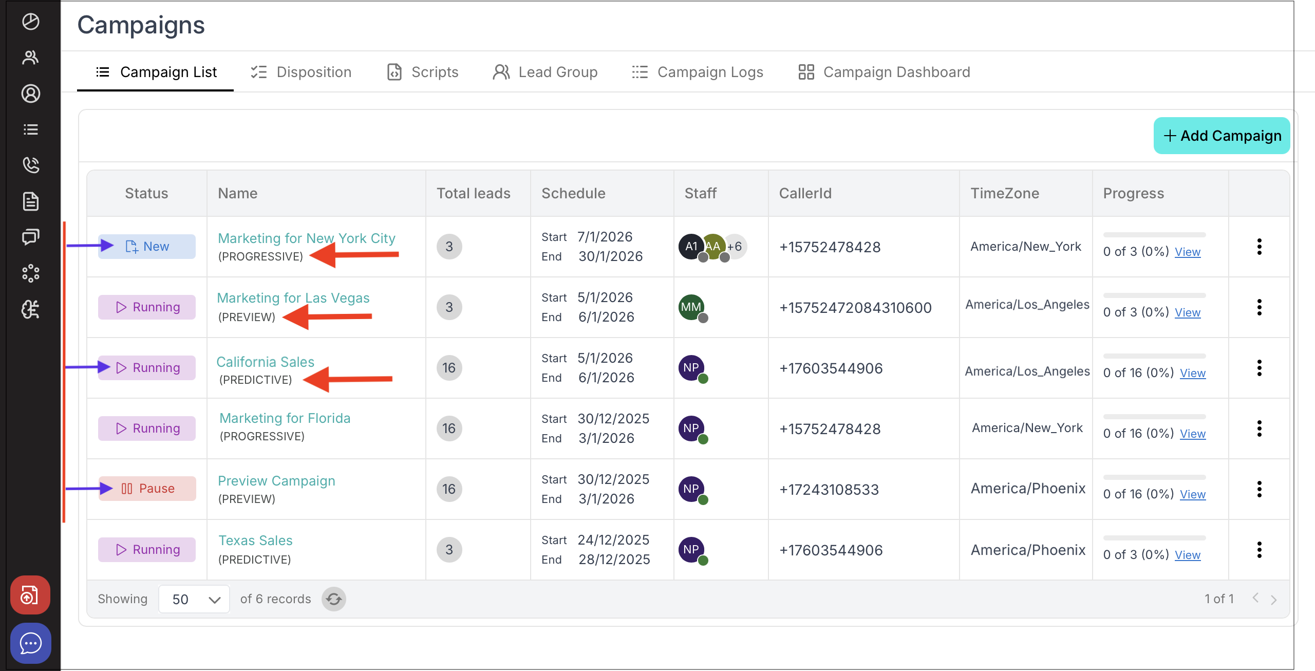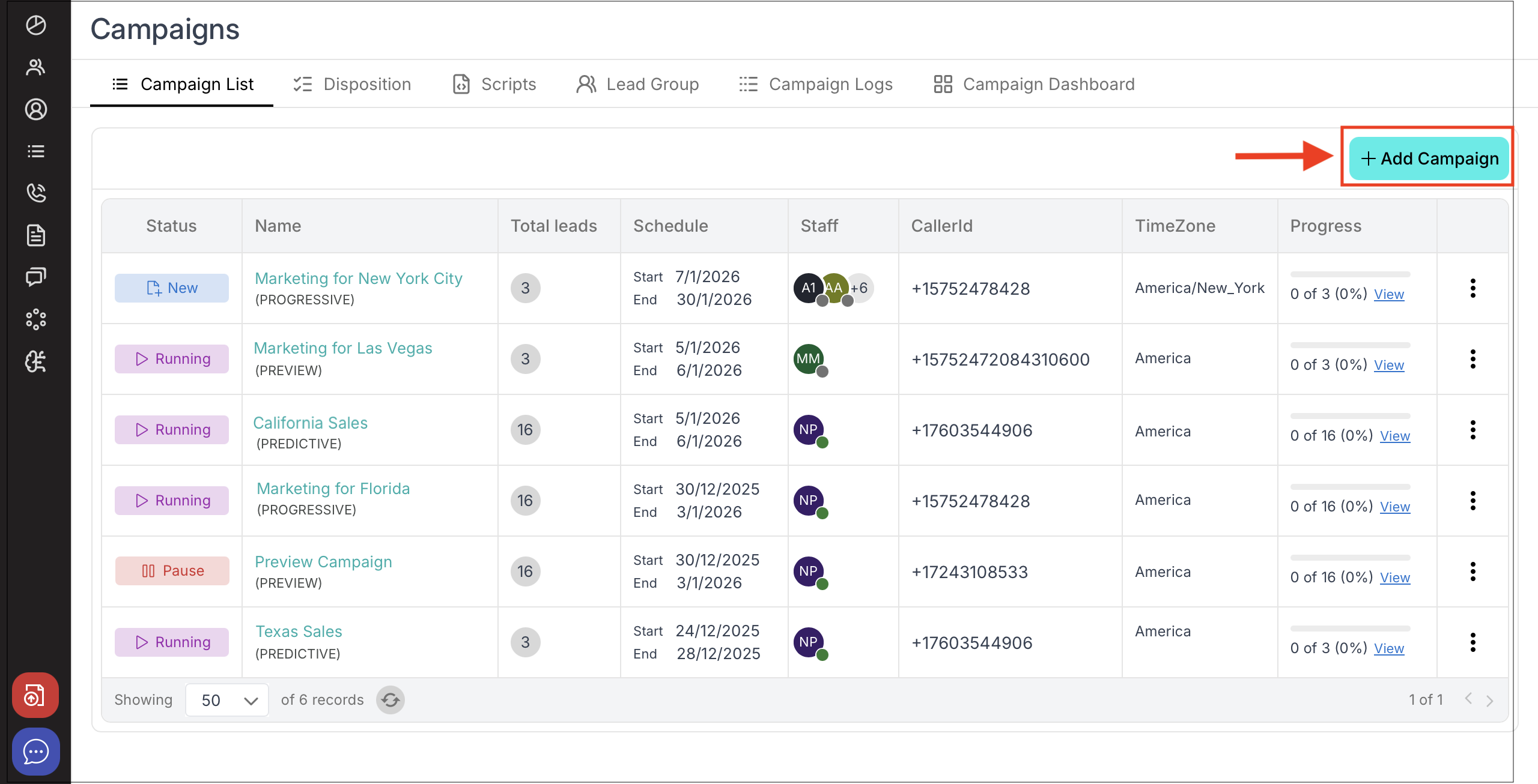 This page displays all existing campaigns along with their status, total leads, assigned staff, caller IDs, and progress. It gives you a complete overview of all active, preview, and predictive campaigns in one place.