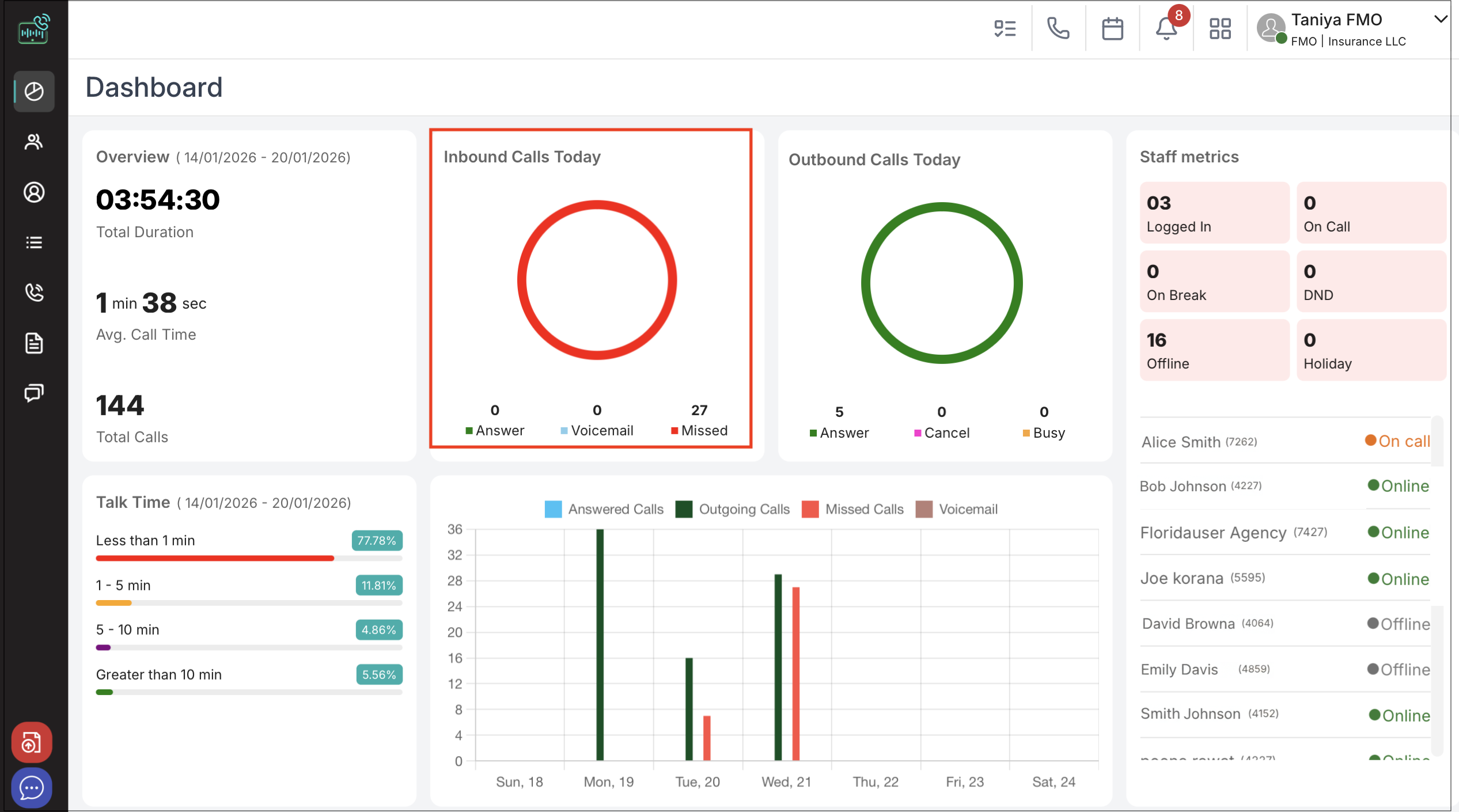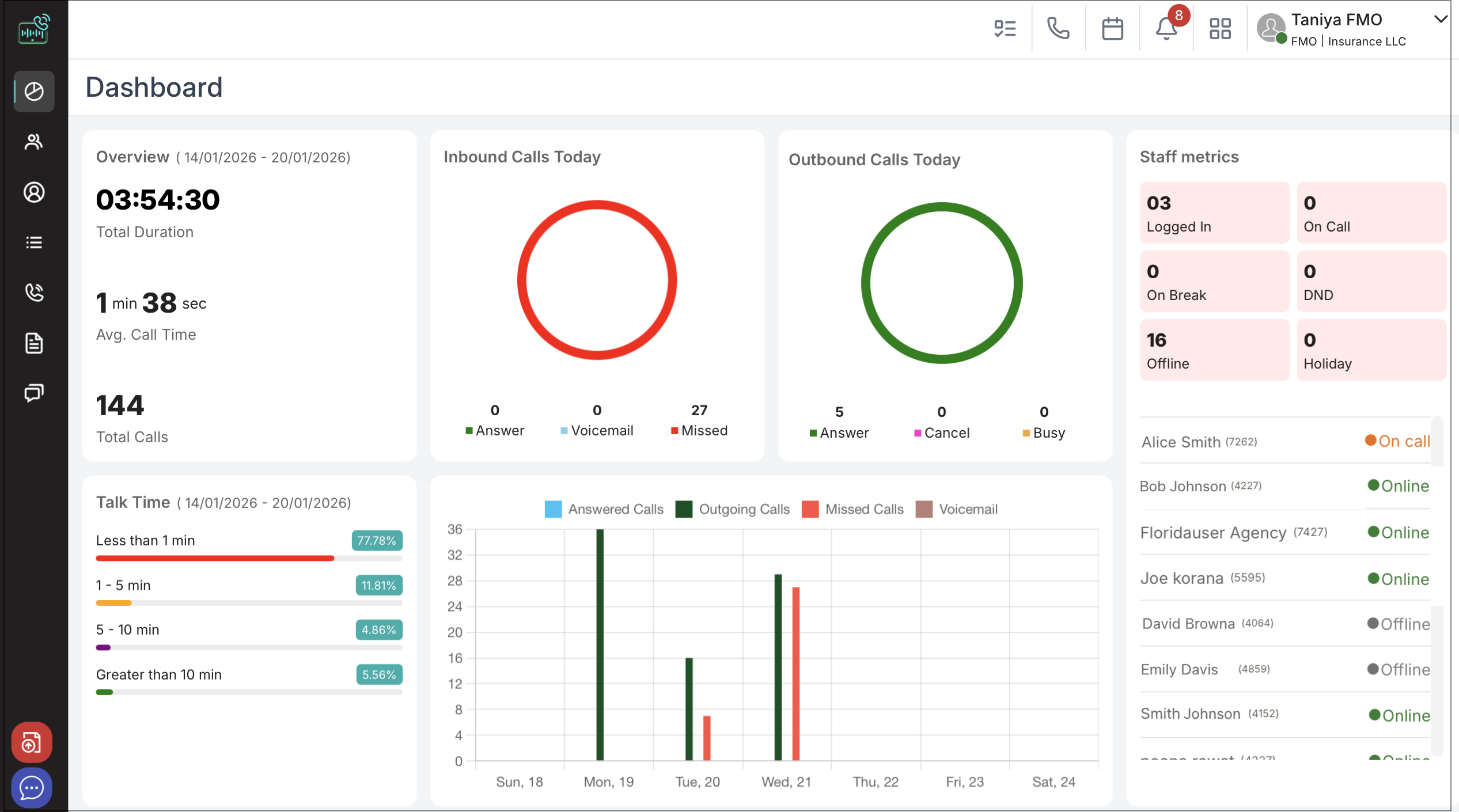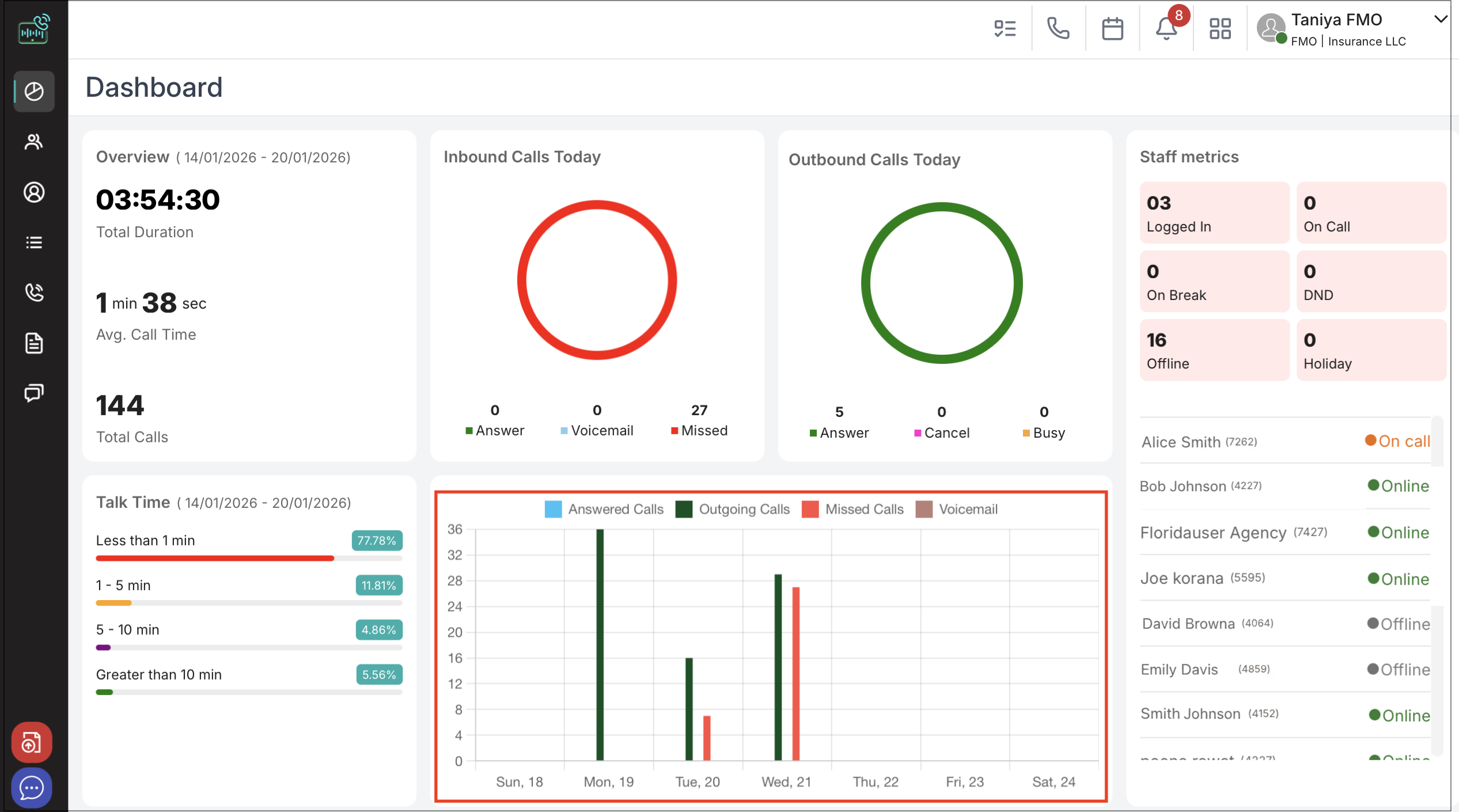 o Plots answered, outgoing, missed, and voicemail calls across recent days.