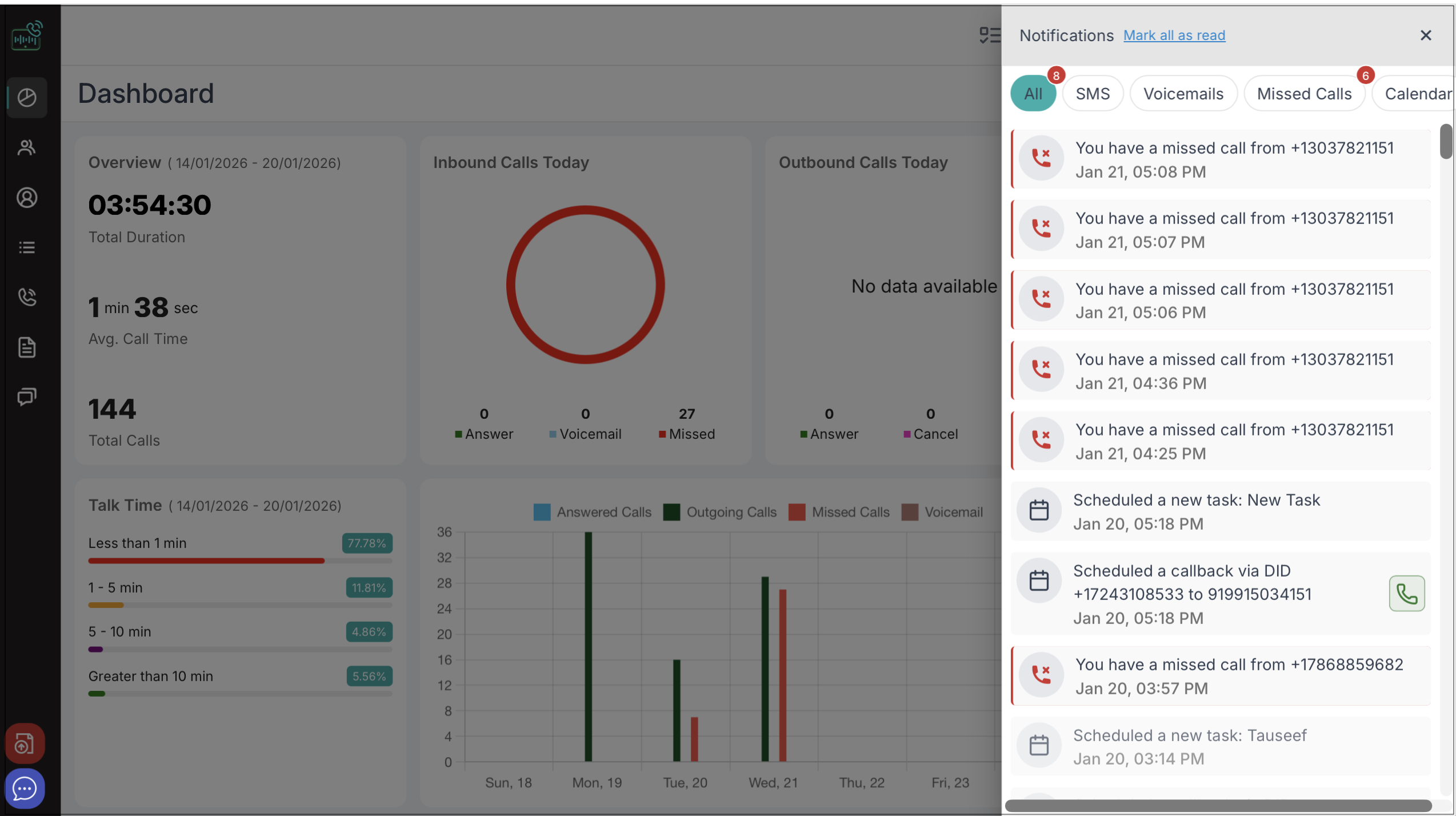 o Offers quick filters to view All notifications, SMS, Voicemails, or Missed Calls.