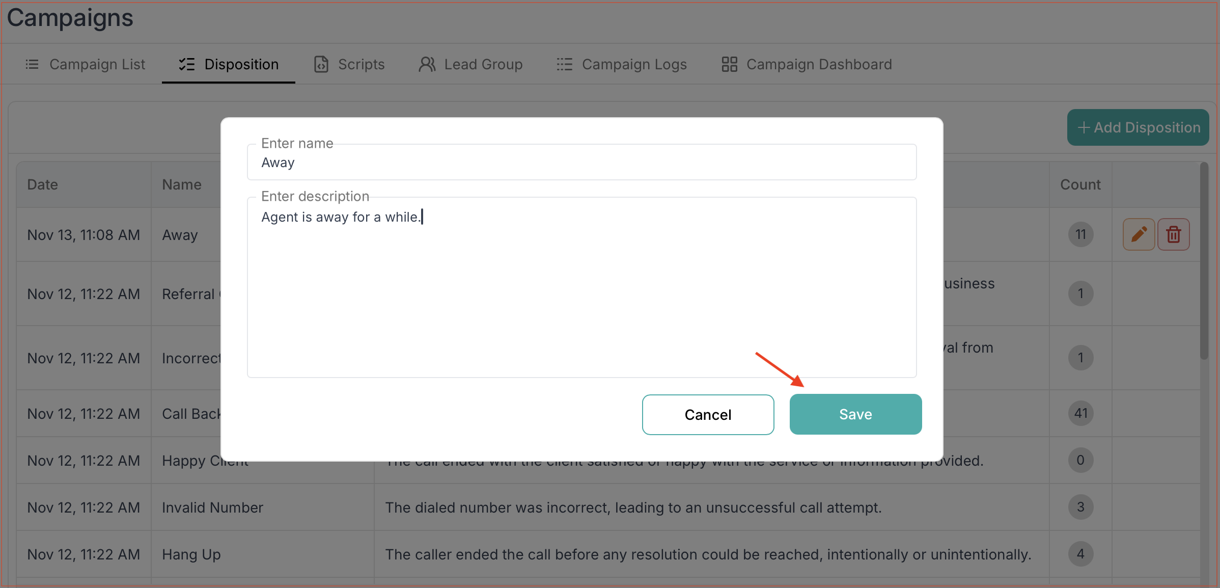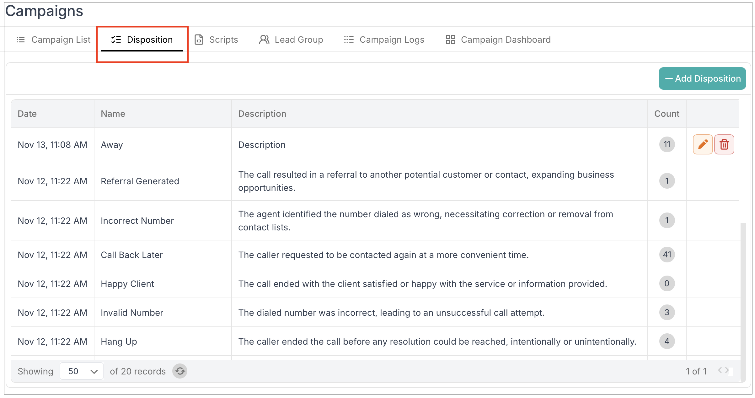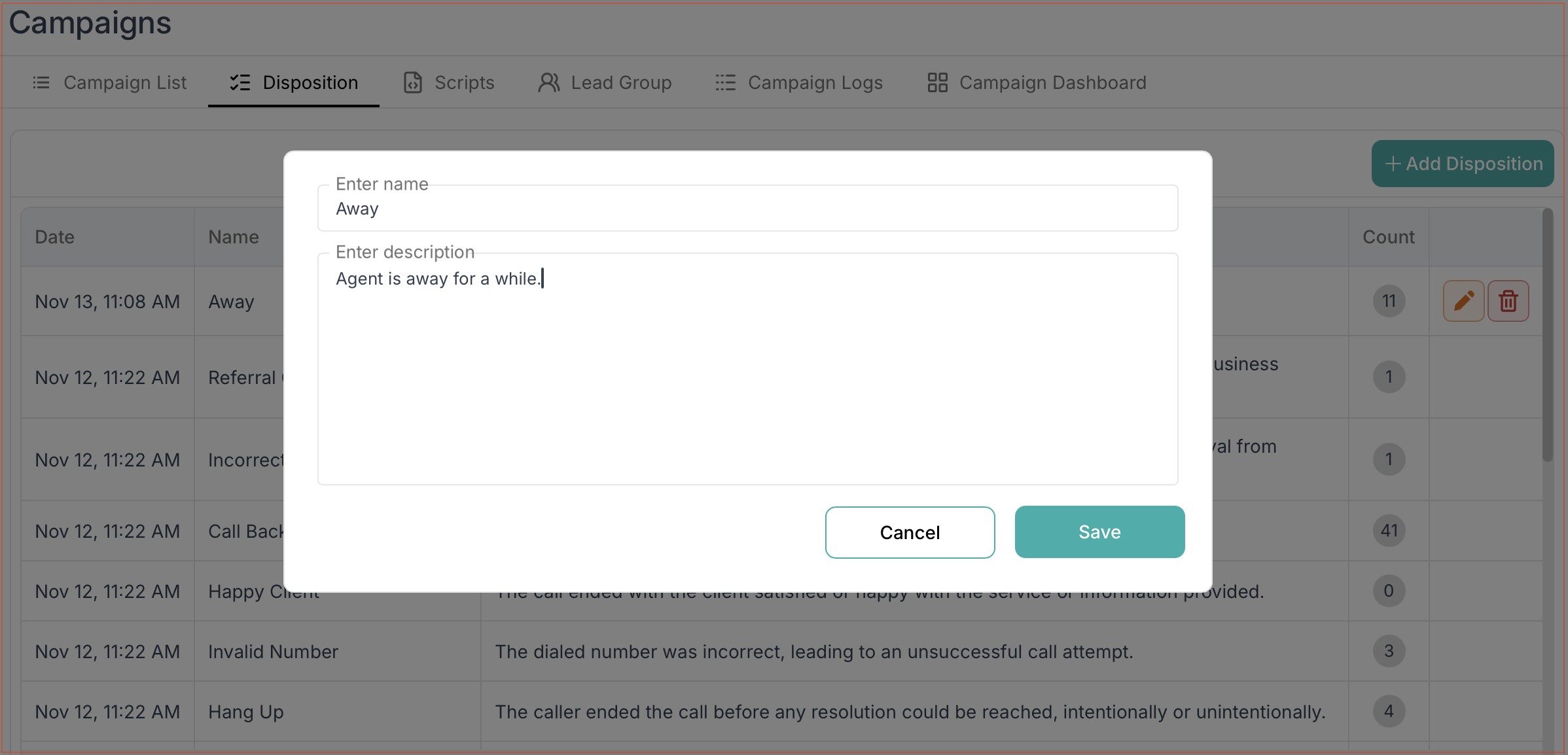 Clear naming and descriptions ensure agents select the correct disposition after each call.