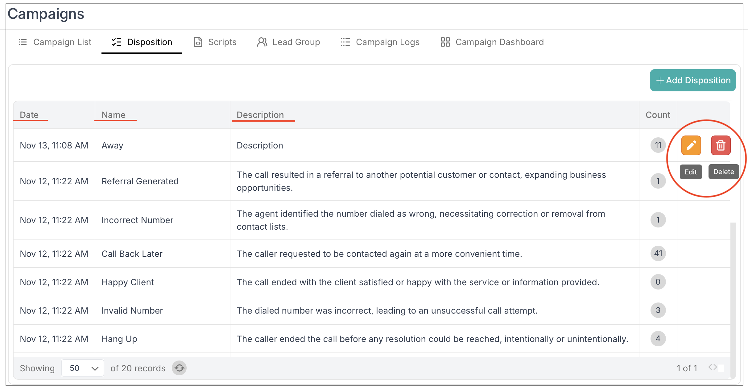Name – Disposition title (e.g., No Answer, Call Back Later)