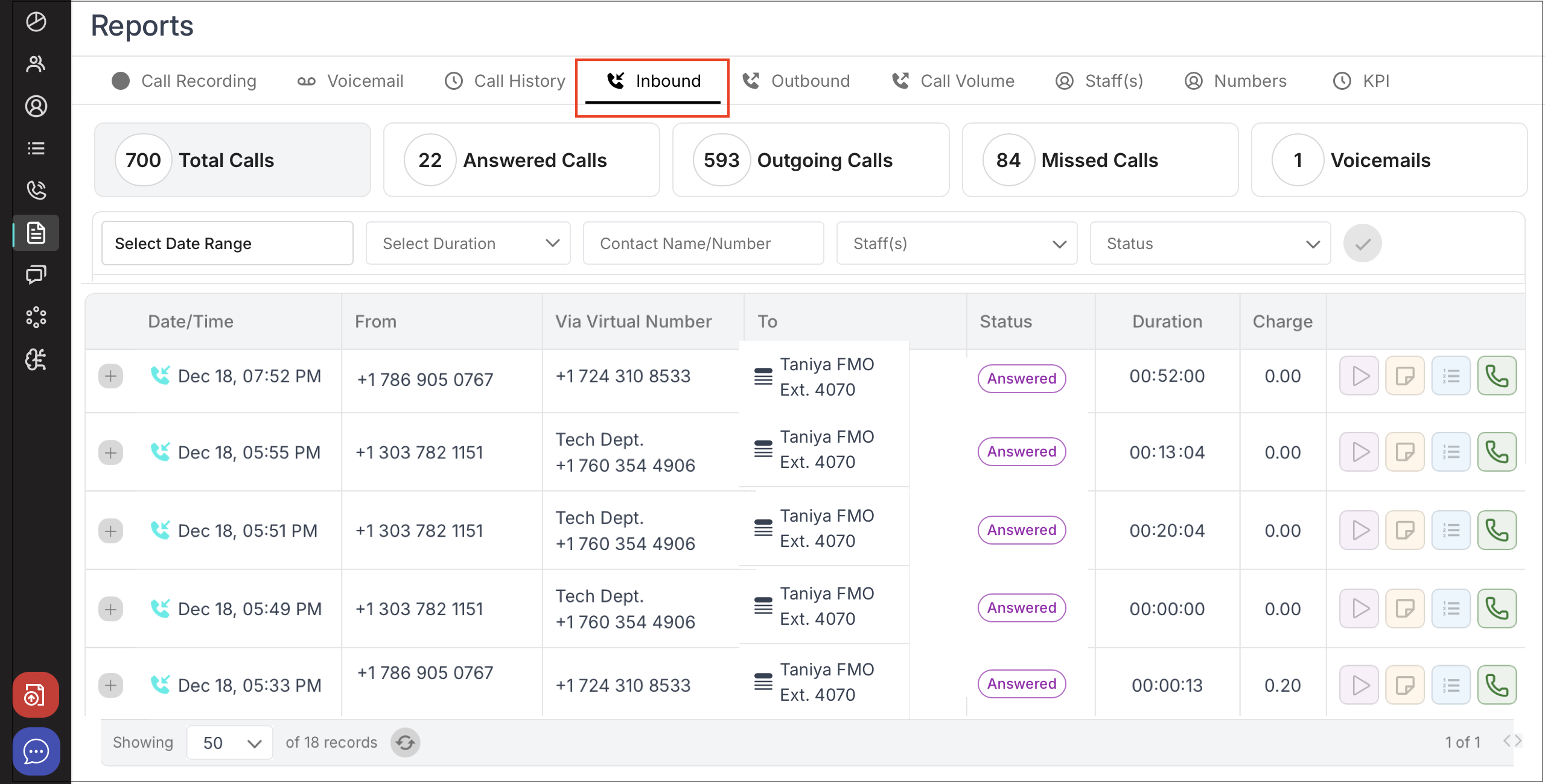 Inbound: Displays incoming calls counts.Includes custom filters for date range, call duration, contact name/number, staff/agent selection, and status.
