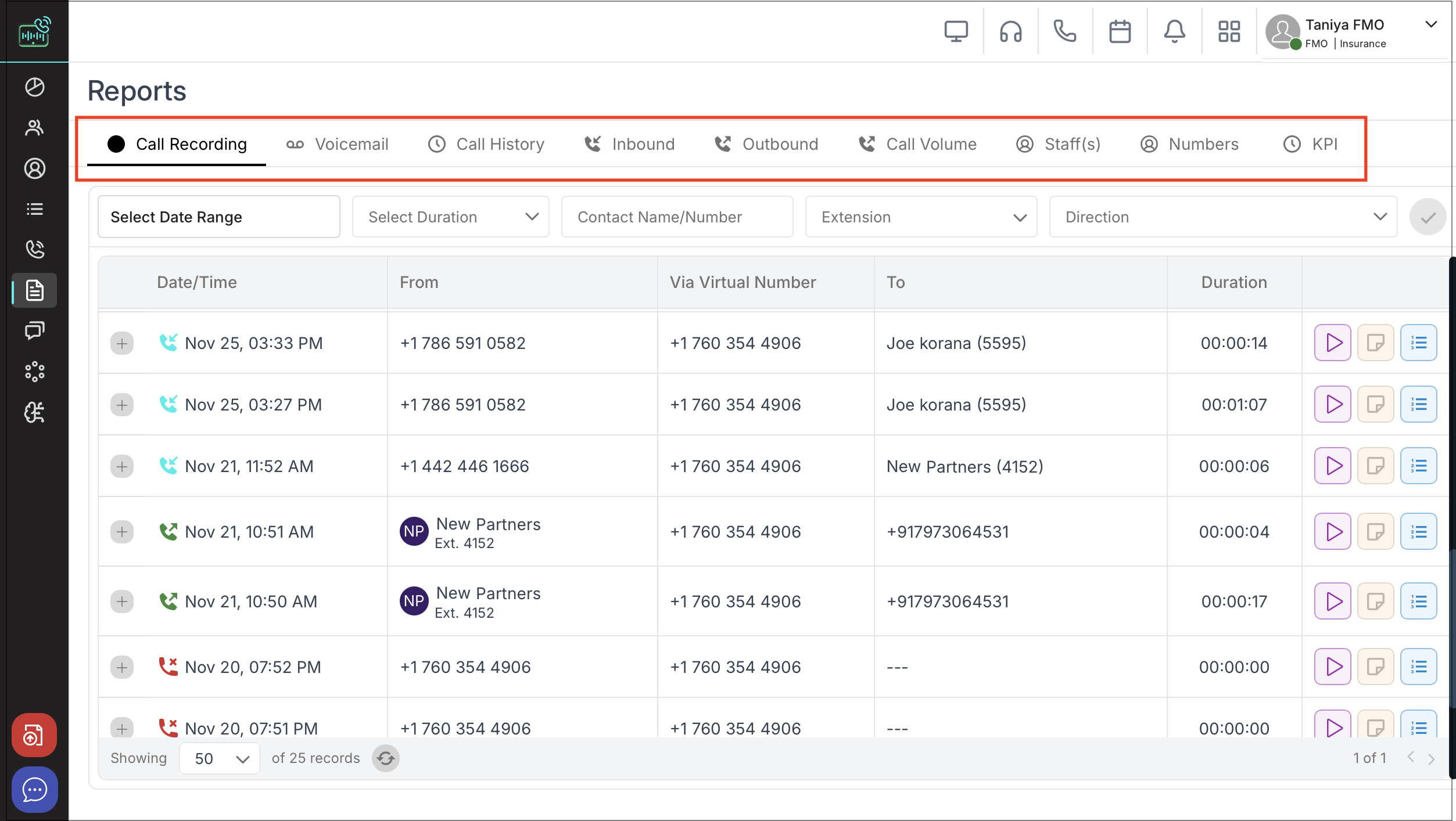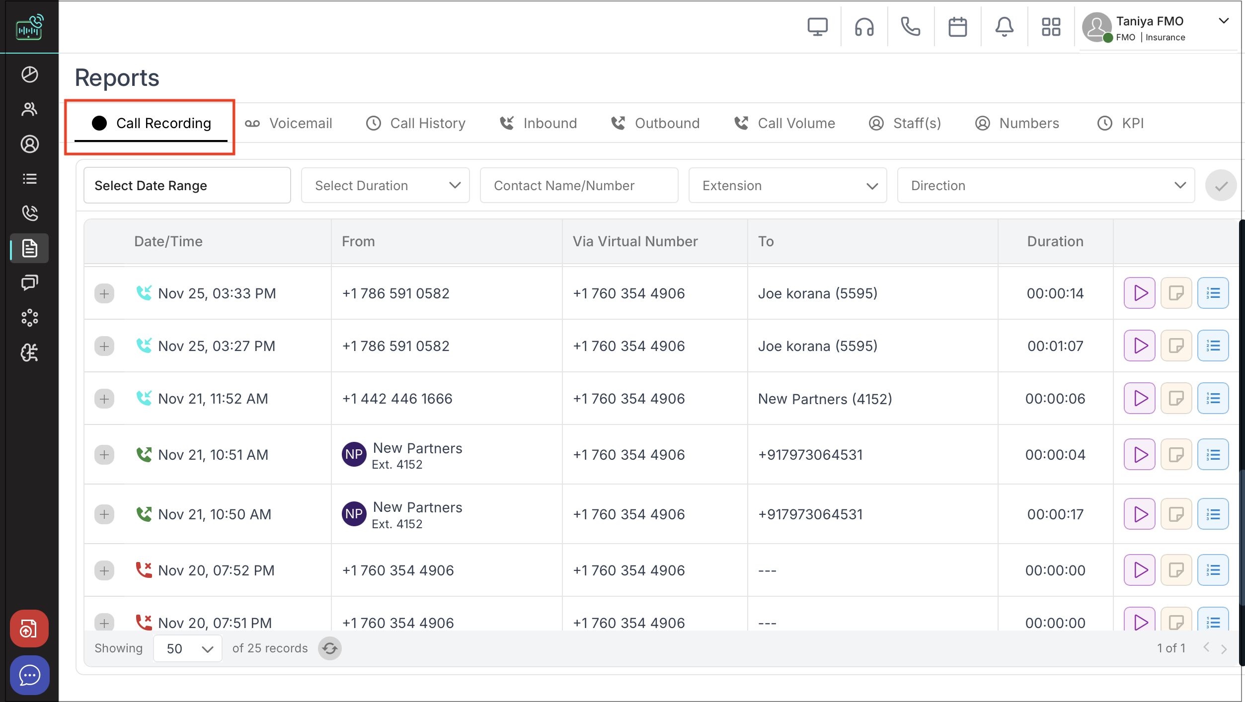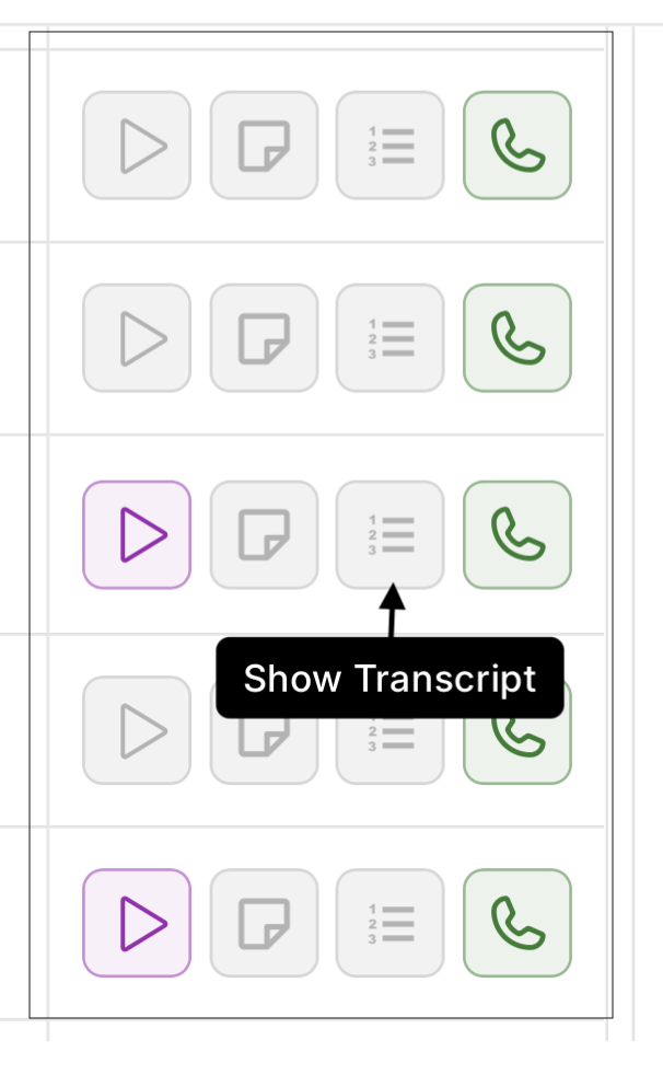 Action icons next to each call for playback, notes and transcript , with visual indicators for incoming/outgoing calls.