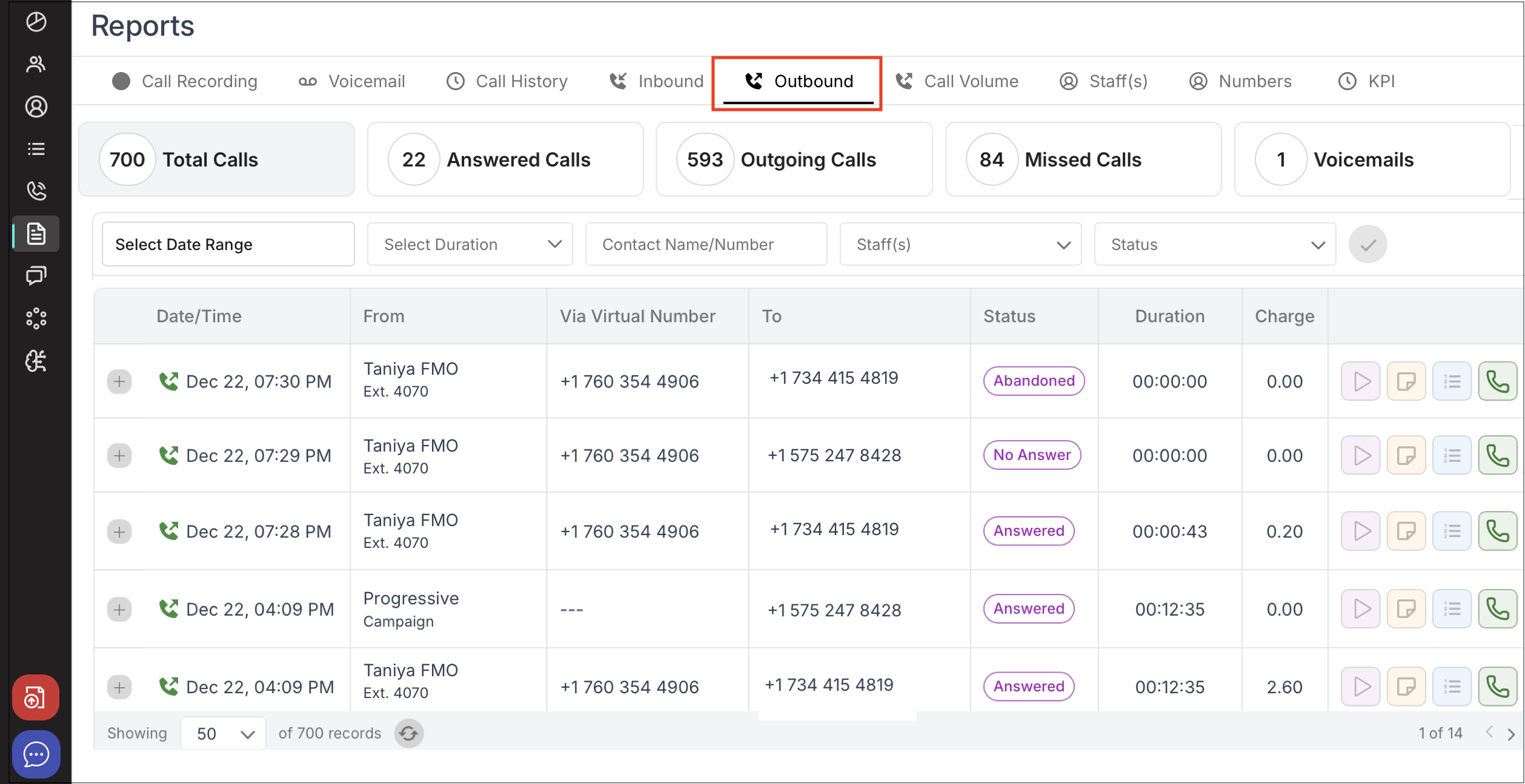 Outbound: Displays outgoing calls counts.Includes custom filters for date range, call duration, contact name/number, staff/agent selection, and status.