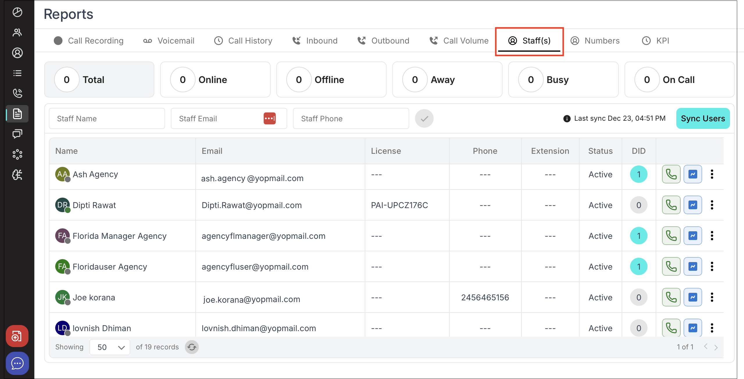 Columns: Name, Email, Phone, Extension, Status, DID.