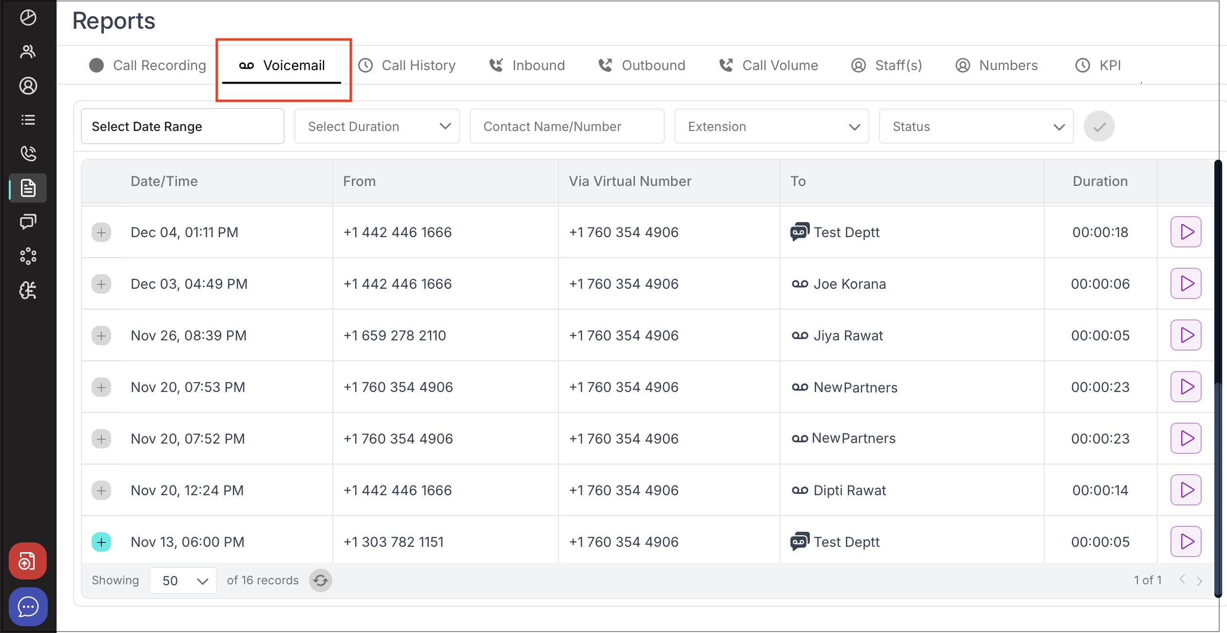 Shows all system-recorded calls by date/time, from, virtual number, to, and duration.